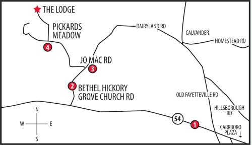 To The Lodge at Pickards Mountain: 1. Take Highway 54 West, and pass Carrboro Plaza on your left. Continue on 54 West for about three miles. 2. Take a right onto Bethel Hickory Grove Church Road. Travel one mile. 3. Turn left onto Jo Mac Rd. Travel one mile. 4. Turn right onto Pickards Meadow, a gravel road. This road is the driveway to the Lodge. Follow the signs to parking and the Lodge.
